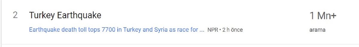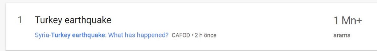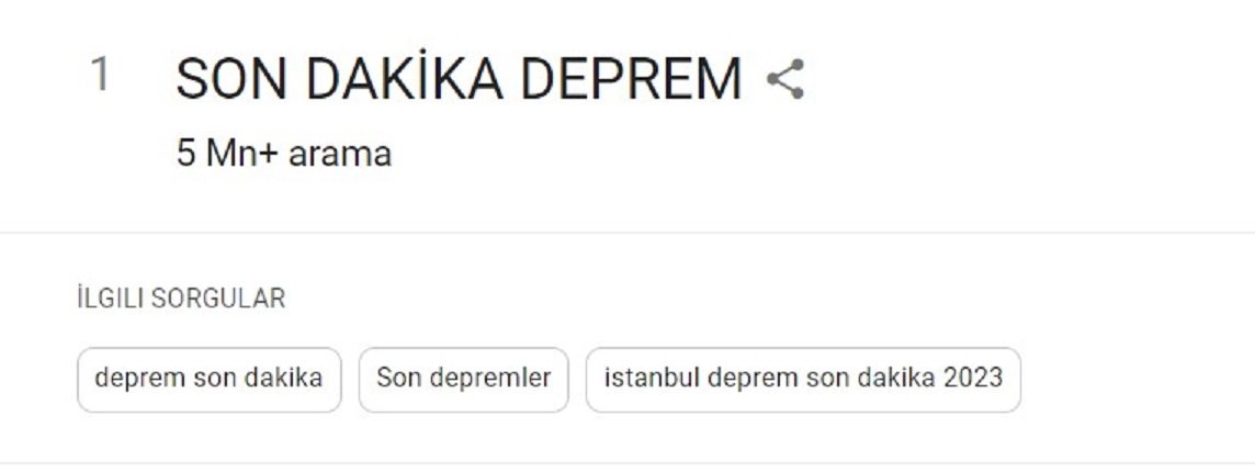 İlk depremin meydana geldiği 6 Şubat tarihinde "Deprem" 5 milyonu aşkın arama hacmine ulaştı.Türkiye'de bu süreçte dünyada en çok yapılan arama “deprem son dakika” olurken, dünya genelinde "Türkiye deprem" şeklinde oldu.