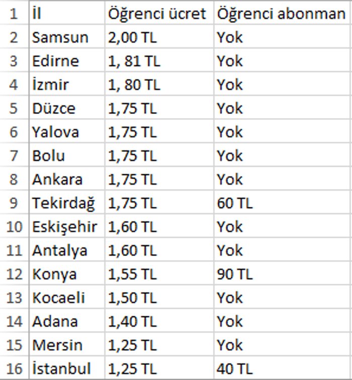 Önce bazı şehirlerimizdeki öğrenci toplu taşıma ücretlerine bir göz atalım.