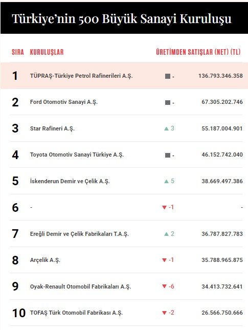 Geçen sene 8. sırada olan Koç Holding bünyesindeki diğer şirket TOFAŞ da 26,6 milyar TL'lik satış rakamıyla 10. sıraya geriledi.