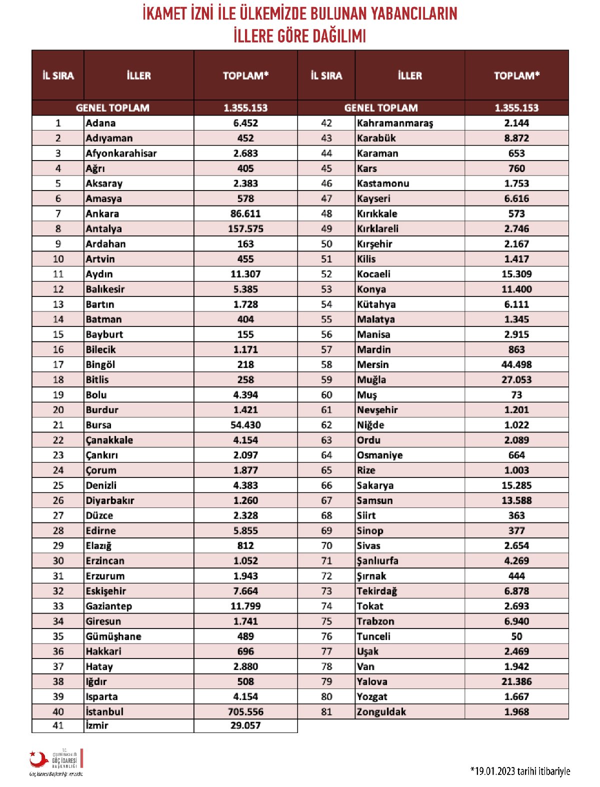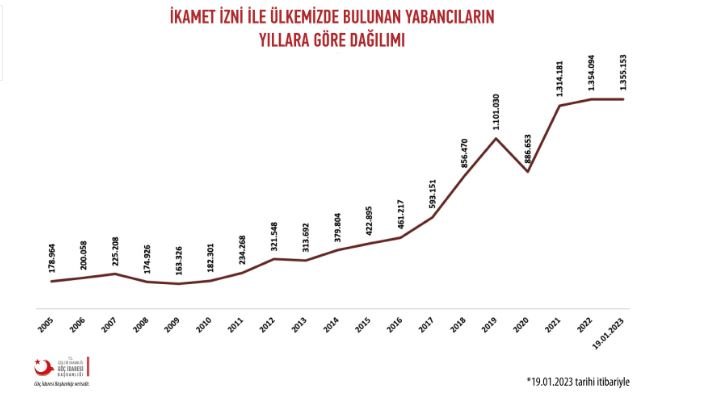 Türkiye’de oturma izinli yabancı sayısı 2005 yılından bu yana yüzde 657 oranında arttı. Oturma iznine sahip yabancıların yarısından fazlası İstanbul’da yaşıyor. İçişleri Bakanlığı Göç İdaresi Başkanlığı verilerine göre, oturma iznine sahip olan yabancı sayısı 2005 yılında 178 bin 964 iken, 7 Ocak 2022 tarihi itibarıyla 1 milyon 354 bin 94’e çıktı. Türkiye’de ikamet izni ile hangi ülkeden kaç kişi var