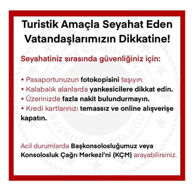 Açıklamada, pasaportların fotokopisinin taşınması, kalabalık alanlarda yankesicilere karşı tedbirli olunması ve üzerlerinde yüksek miktarda nakit bulundurulmaması tavsiye edildi.