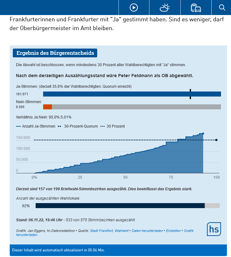 Başta partisi SPD olmak üzere, tüm partilerin gitmesini istediği Feldmann, istifa etmemekte direnince, referandum kararı alınmıştı. 508 bin seçmenin olduğu kentte, oylamanın geçerli olması için en az 153 bin kişinin oy vermesi gerekiyordu, bu rakam 202 bine dayandı.