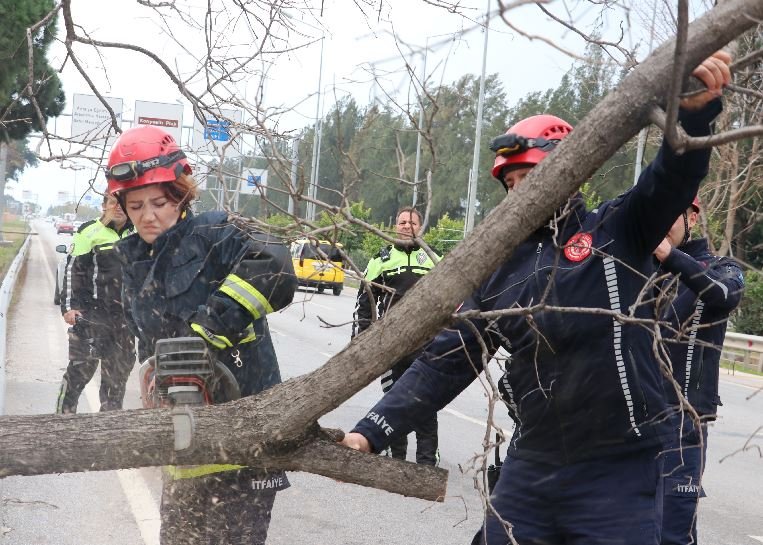 Antalya'da Muratpaşa ilçesi Dumlupınar Bulvarı'ndaki ağaç, kuvvetli fırtınada yola devrildi. İhbarla bölgeye itfaiye ve trafik ekipleri, sevk edildi. Ağaç, itfaiye eri tarafından ağaç motoruyla kesildi.