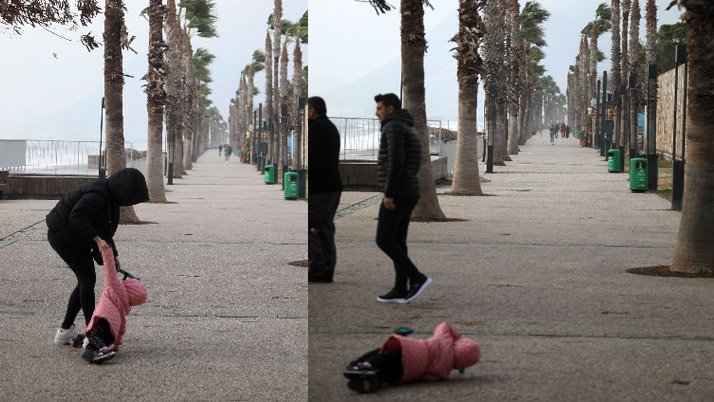 Konyaaltı Sahili'nde dalgalar bazı noktalarda sahil bandına kadar ulaştı. Bazı kişiler ise kuvvetli rüzgara rağmen sahile gelip dalgaların önünde fotoğraf çektirdi. Sahil bandında skutere binen ve rüzgarla devrilip düşen çocuğu annesi kaldırdı.