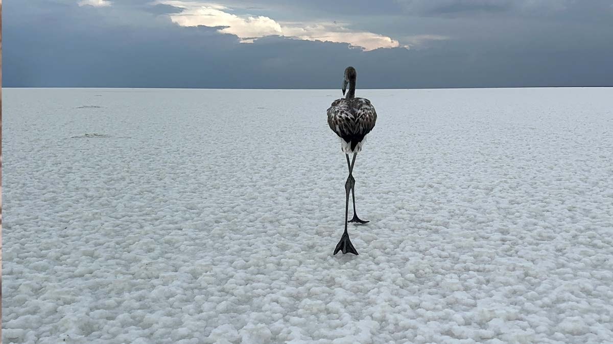 Bembeyaz gölün üzerinde renk cümbüşü oluşturan flamingolar, sıcak ülkelere göç etmeye başlayacak.
