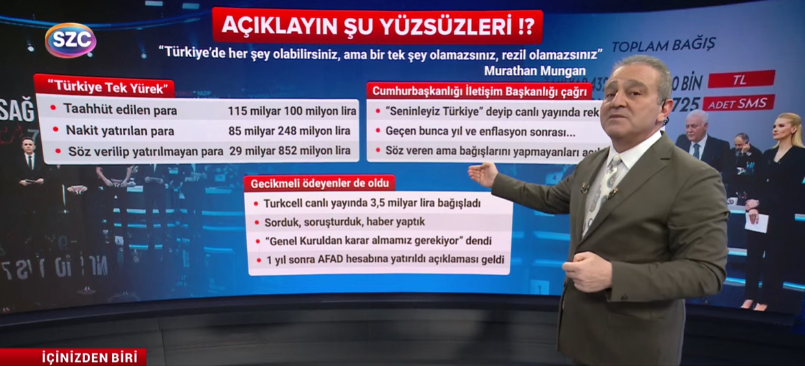 “Türkiye Tek Yürek”, “Seninleyiz Türkiye” diyerek canlı yayınlara bağlanan, tüm Türkiye’nin gözünün içine baka baka bağış sözü veren ama bu sözünü tutmayanların listesi mutlaka açıklanmalıdır.