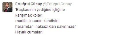 Günay, Twitter'daki adresinden ''Başkasının yediğine içtiğine karışmak kolay; marifet, insanın kendisini haramdan, haksızlıktan sakınması' Hayırlı cumalar!'' diye yazdı.