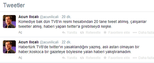 “Komediye bak dün TV8′in resmi hesabından 20 tane tweet atılmış, çalışanlar tweetler atmış, haberi yapan twitter’a girebilseydi keşke. Habertürk TV8′de twitter’ın yasaklandığını yazmış, aslı astarı olmayan bir haber, koskoca bir gazeteye böylesine yalan haberi yakıştıramadım.”