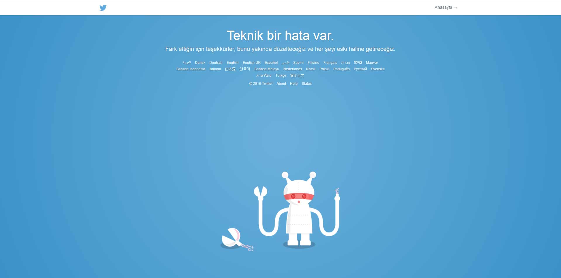 Sosyal medya plartformu Twitter bu akşam saat 22:40 itibariyle 10-15 dakikalık çökme yaşadı. Twitter'ın çökmesiyle birlikte paylaşılan linkler açılmadı ve yönlendirilmesi gereken sayfa yerine, "Teknik bir hata var" yazılı sayfa açıldı.