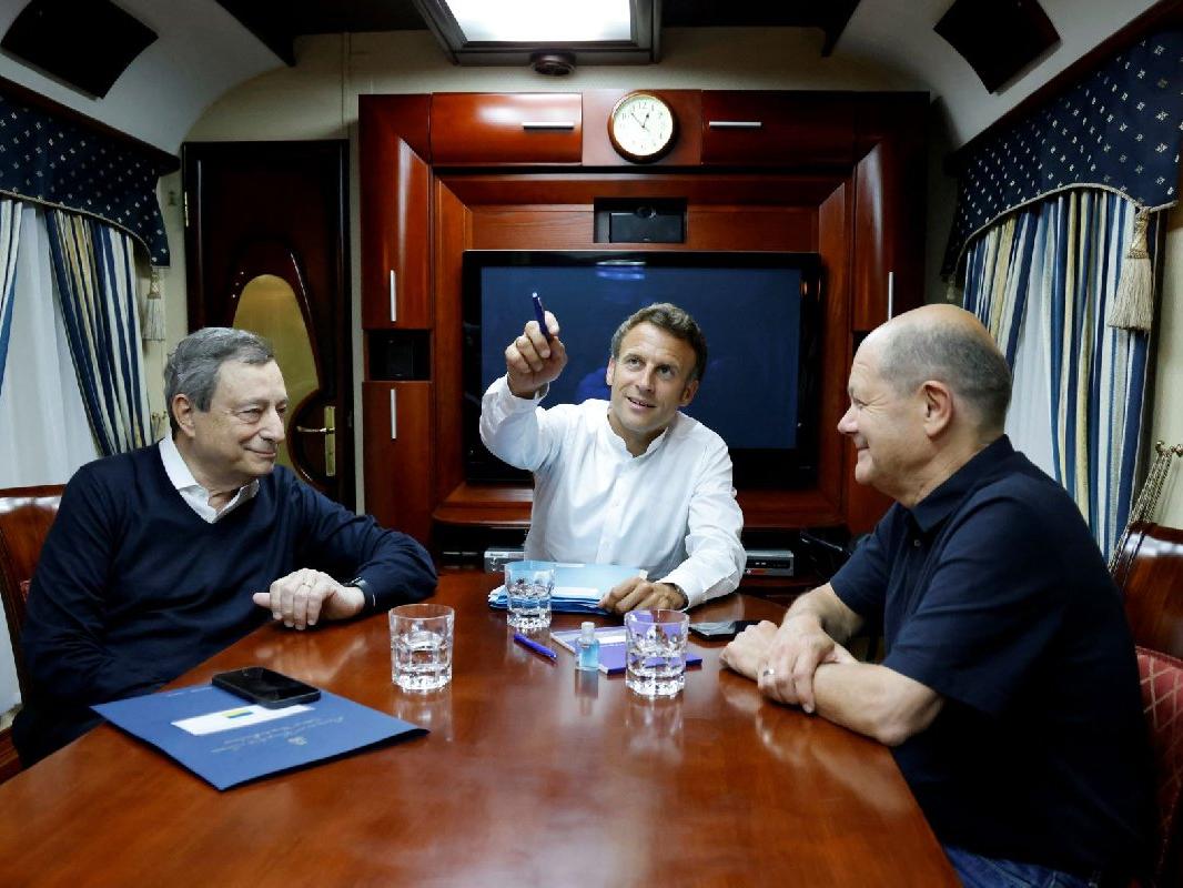 Fransa hükümeti, Cumhurbaşkanı Emmanuel Macron, Almanya Başbakanı Olaf Scholz ve İtalya Başbakanı Mario Draghi’nin Kiev’e giden gece treninde çekilen görüntülerini paylaştı. Üç liderin trendeki bir masada sohbet ettiği görüntüler televizyon kanallarında paylaşıldı.