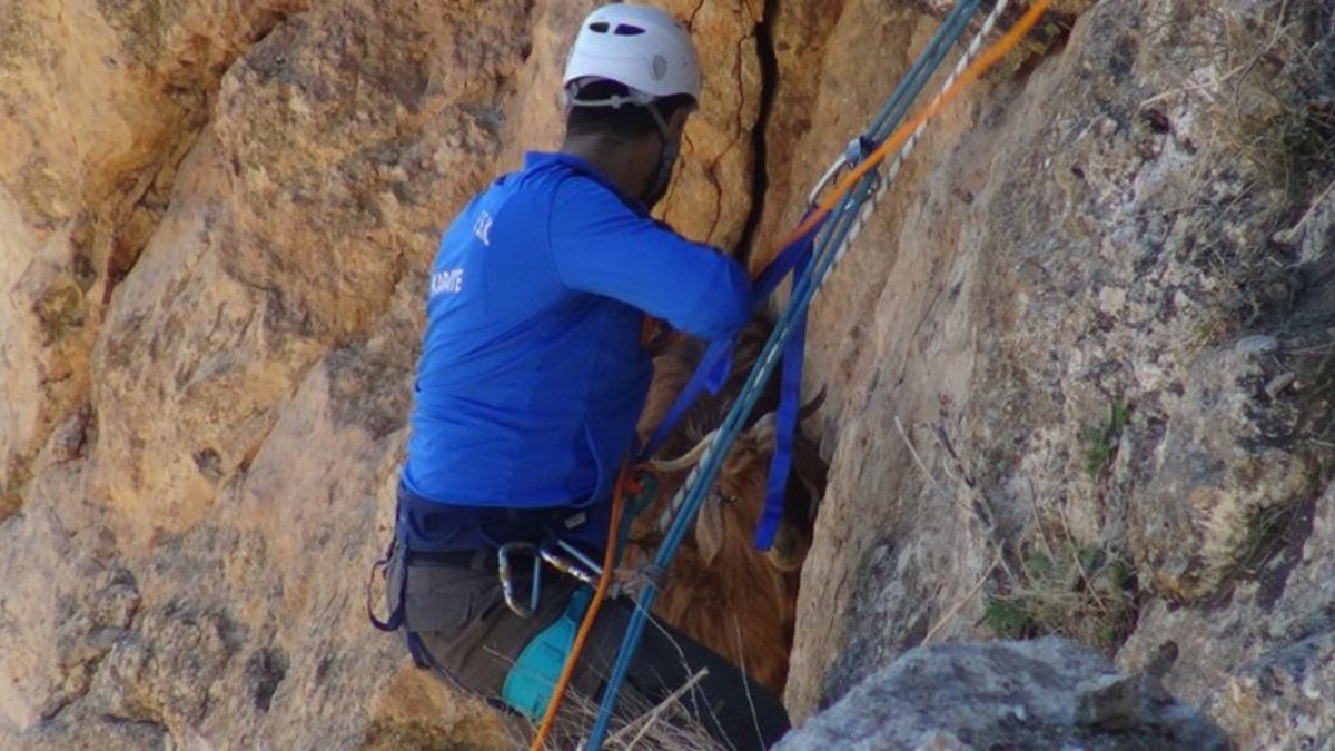 Bölgeye giden Yıldız, halatla 4 saatlik çalışmanın ardından keçiyi kurtardı.