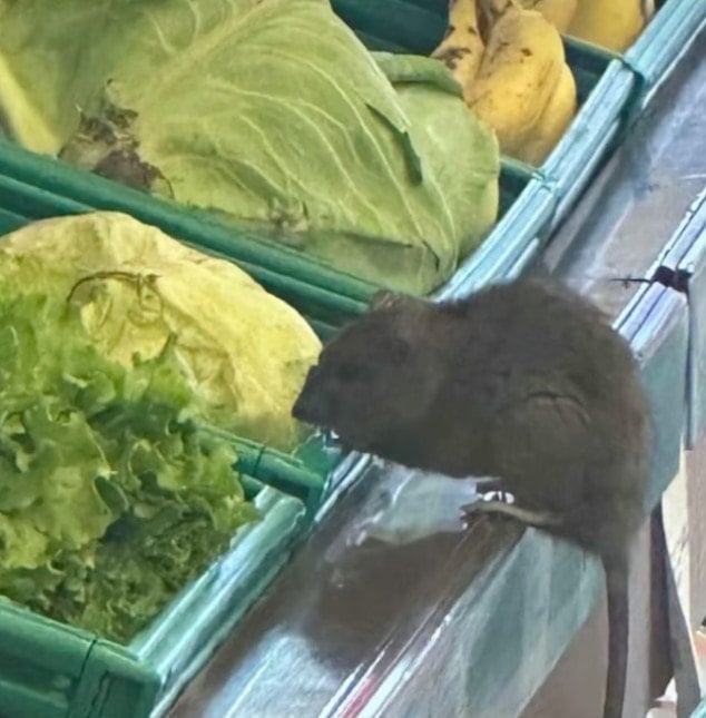 Bursa'nın İnegöl ilçesinde çekilen görüntülerde, üç harfli bir market zincirine ait şubenin manav bölümünde bir farenin kasalardaki sebzeleri kemirdiği görüldü.