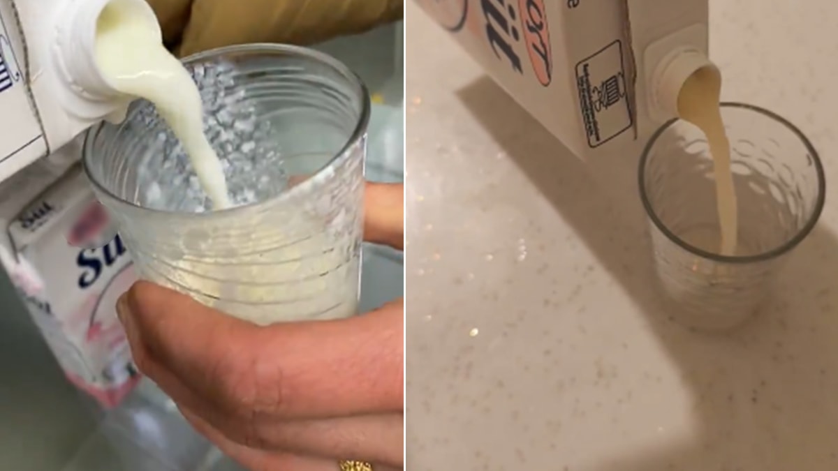 Sosyal medyaya yansıyan görüntülerde sütün bozuk olduğu ve kesik bir şekilde bardağa aktığı görüldü.