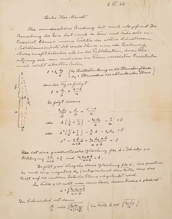 Ünlü fizikçi, 1936'da üç sayfalık bir kağıda yerçekimsel bir merceğin diyagramını ve 30'dan fazla karmaşık hesaplamayı not etti. Şimdi bu belge, 'Yerçekimi alanındaki ışığın sapmasıyla bir yıldızın lens benzeri hareketi' adlı makalesinin taslağıyla birlikte satıldı.