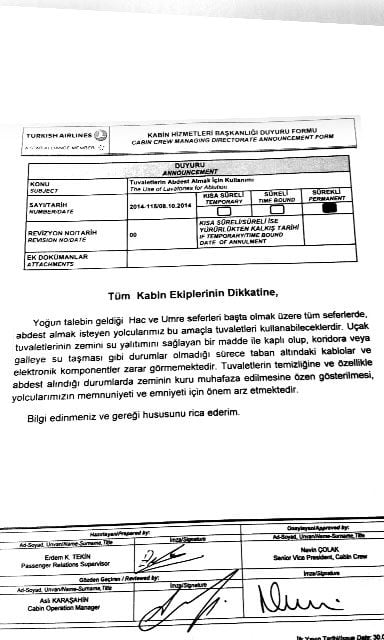 DUYURUDA bu kararın yolcuların talebi üzerine alındığı belirtildi. Uçak tuvaletlerinde abdest almak bugüne kadar “uçuş güvenliğine aykırı olduğu” gerekçesiyle yasaktı. Abdest alırken yere sızan suların tabandan geçen kablolara zarar verme riski olduğu belirtiliyordu. Özellikle Hac ve Umre ziyaretleri için yolcu taşıyan hatlarda sık sık anonsla, uçakta abdest almanın yasak olduğu hatırlatılıyordu.