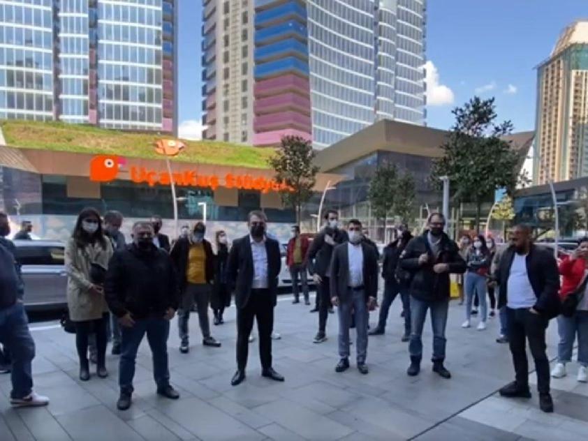 Uçankuş TV’nin işten çıkarılan ve maaşlarını alamadıklarını ifade eden 80 çalışanı seslerini duyurmak için televizyon binası önünde toplandı.