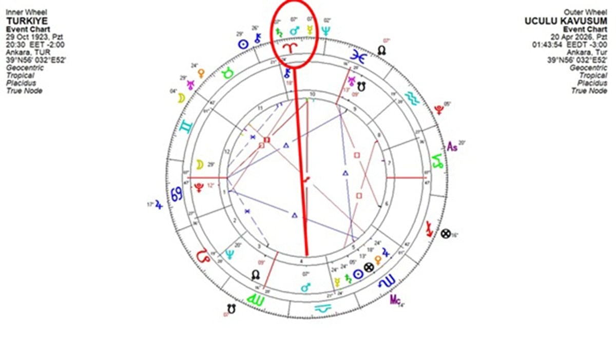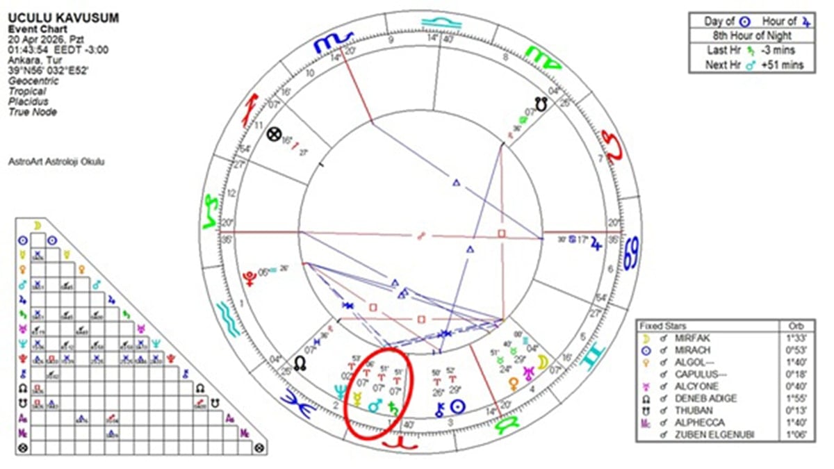 20 Nisan tarihinde Mars ve Satürn 7 derece Koç burcunda kavuşacaklar. Aynı gün, Merkür de bu kavuşuma dahil olacak ve 21 Nisan’da devam edecek. Dolayısıyla üçlü kavuşum haline gelecek. Bu üç gezegen, Mars, Satürn ve Merkür bir arada olduğunda 19. yüzyıl müneccimi Sadullah El-Ankaravi’ye göre savaş işaretçisidir. Eserinde şöyle diyor: “Savaş ve çatışma işareti olan gezegenler Mars, Satürn ve Merkür’dür ve bunların arasında meydana gelen olumsuz açılardır. Yani düşman açılar ve kavuşumdur.” Merkür’ün Mars ve Satürn ile hizalanması hakkında Sadullah Efendi “savaşların ve isyanların çıkmasına, liderlerinin halk tarafından karalanmasına” sebep olur diyor.