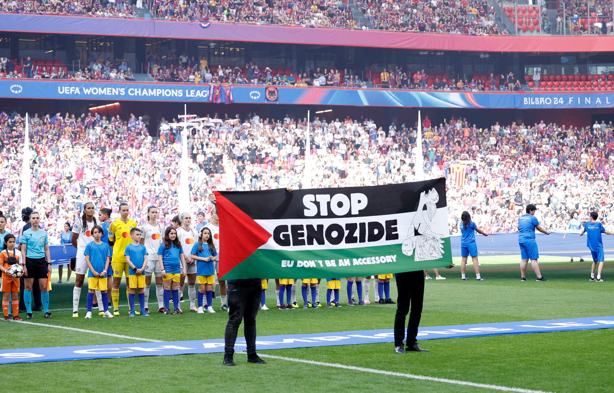İspanya'nın Bilbao kentindeki San Mames Stadı'nda Barcelona ve Olimpik Lyon takımları arasında oynanan UEFA Kadınlar Şampiyonlar Ligi finalinde sahada "Soykırımı durdurun" yazılı pankart açıldı.