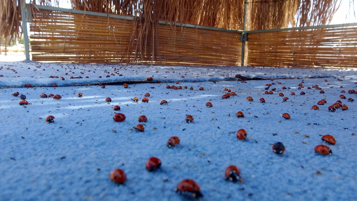 * Yaklaşık bir haftadır uğur böceği istilası yaşıyoruz. Sahilleri sardılar evimizin balkonları ve dış cephelerini sardılar. Evden çıkamıyoruz.
