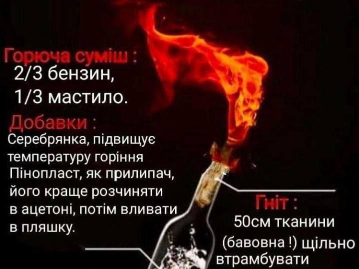 Ukrayna Devlet Özel İletişim ve Bilgi Koruma Müdürlüğü, Facebook hesabından halkın savunma yapması için molotof kokteyli tarifi ve nasıl kullanacağı bilgisi içeren broşür görselleri yayınladı. Ukrayna İçişleri Bakanlığı’na ait Telegram kanalından da yine molotof kokteyli yapımı tarifi paylaşıldı. Yetkililer, paylaşımla birlikte halkı Ukrayna’yı savunmaya çağırdı.