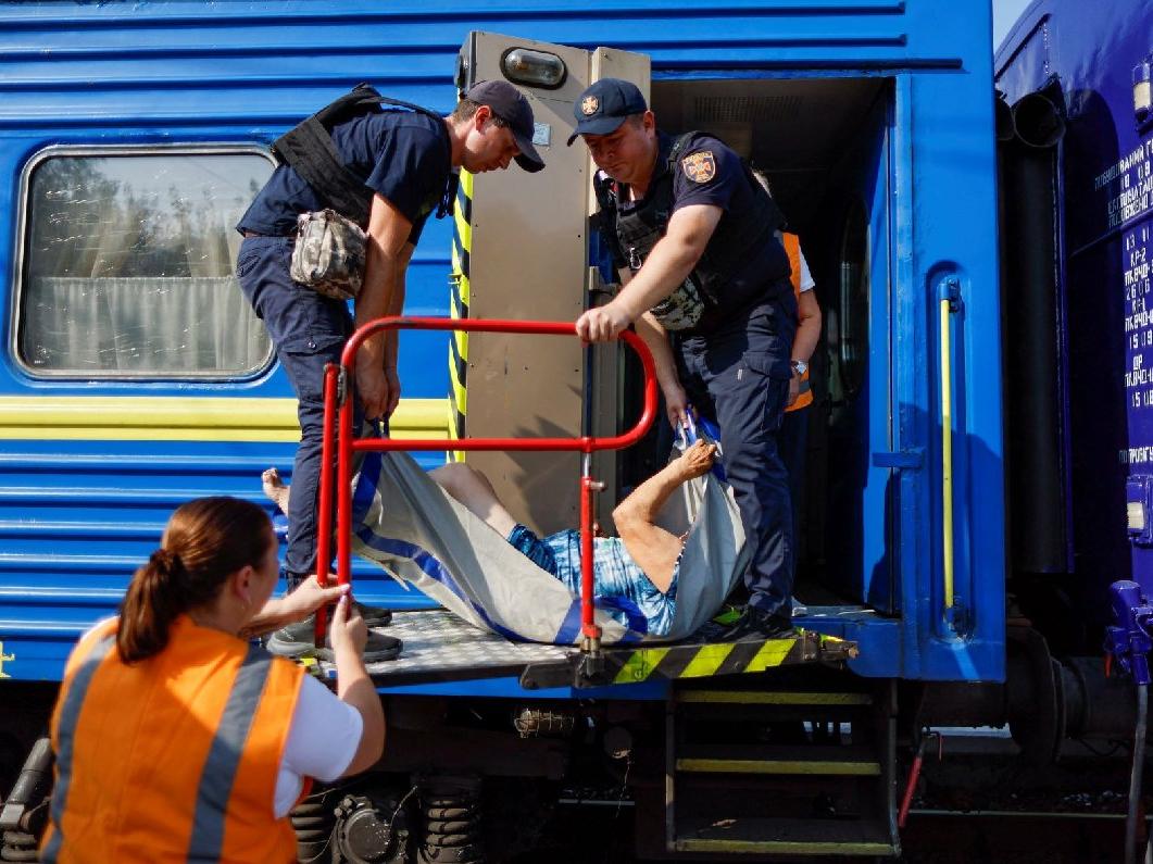 Evlerini terk etmek zorunda kalan hasta ve yaşlıların yorgunlukları kameralara yansıyor. Ayakta durmakta dahi zorlanan yaşlı ve hastalar, trendeki engelli asansörü ile görevliler tarafından vagonlara bindiriliyor. İstasyona gelen trene, önce yaşlılar ve hastalar bindiriliyor. Daha sonra ise saatlerdir istasyonda bekleyen ve güvenli bir liman arayan kişilerin binişine izin veriliyor. (AA)