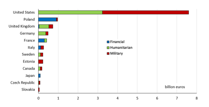 ABD bu savaşta Ukrayna'nın en büyük mali destekçisi olurken Polonya ise yaklaşık 1,1 milyar dolar ile ABD'den sonra Ukrayna'ya en çok para veren ülke oldu. Polonya'nın ardından listede sırasıyla İngiltere ve Almanya yer aldı.