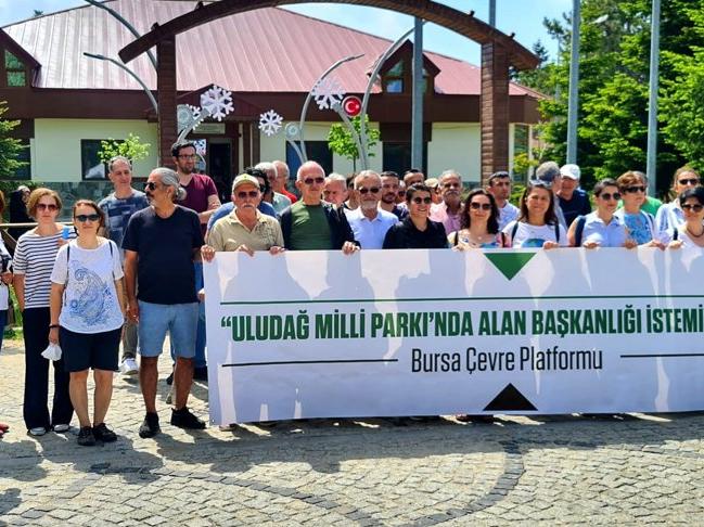 Uludağ Sarıalan Milli Parkı Müdürlüğü önünde 'Uludağ Milli Parkı'ında Alan Başkanlığı istemiyoruz' pankartı açan Bursa Çevre Platformu, "Ülkemizde son 20 yıldır tarım alanlarımıza, sularımıza, ormanlarımıza kısaca yaşam alanlarımıza şirket-yönetim işbirliği ile acımasız, kanunsuz ve kuralsız bir yok ediş arttı. Yaşadığımız kent Bursa bundan 30 yıl önce 'Yeşil Bursa’ adıyla anılırdı. Ama gittikçe artan ve teşvik edilen nüfus yoğunluğunun getirdiği kontrolsüz çarpık kentleşme, kaçak ve yasal sanayileşme betonlaşmayı arttırmış, Bursa’nın tarımı, havası ve suyu kirletilmeye ve hızla yok olmaya başlamıştır. Artık Bursa havası en kirli şehirlerden biri ve şehir merkezinden geçen dereleri fabrikaların deşarj ettiği kimyasal atık halinde akıyor. Verimli Bursa ovalarındaki tarım alanları hızla betonlaşıyor" açıklamasında bulundu.