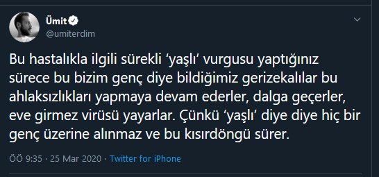 "Bu hastalıkla ilgili sürekli 'yaşlı' vurgusu yaptığınız sürece, bu bizim genç diye bildiğimiz geri zekalılar bu ahlaksızlıkları yapmaya devam ederler, dalga geçerler, eve girmez virüsü yayarlar. Çünkü 'yaşlı' diye diye hiç bir genç üzerine alınmaz ve bu kısırdöngü sürer"