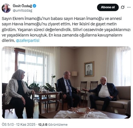 Zafer Partisi lideri Ümit Özdağ, Ekrem İmamoğlu'nun babası Hasan İmamoğlu ve annesi Havva İmamoğlu'nu ziyaret etti. Ziyaretini sosyal medya hesabından paylaştı.
