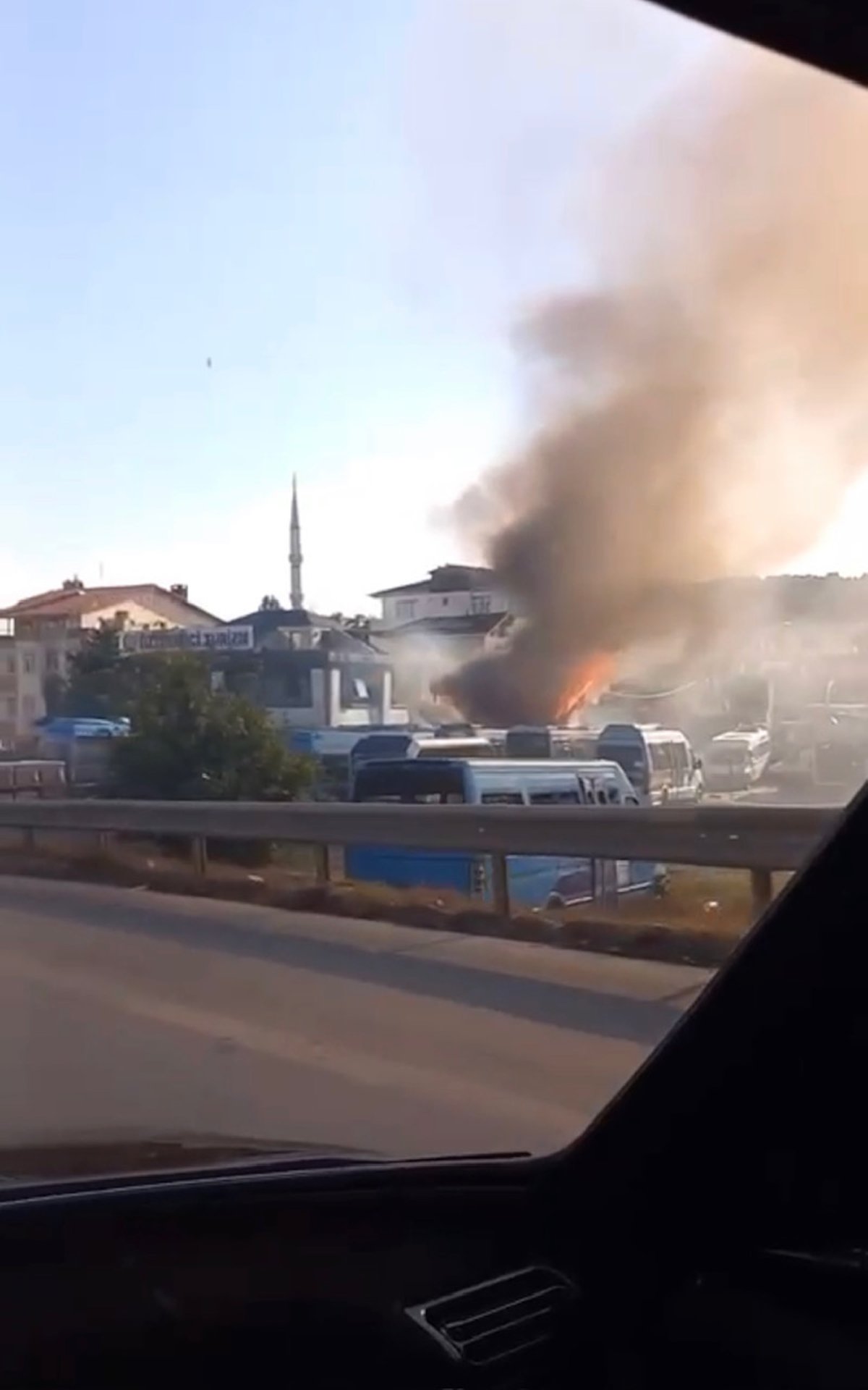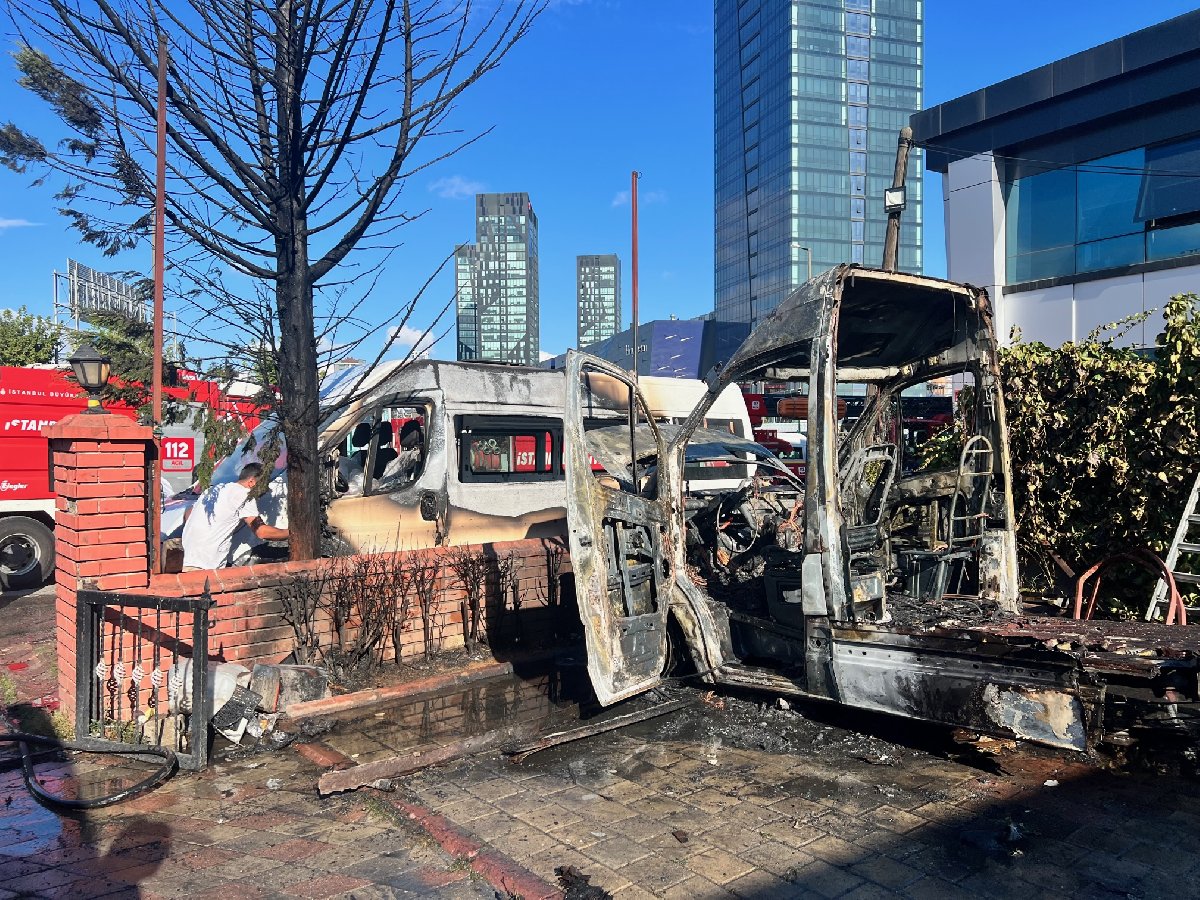 İşyeri bahçesinde park halindeki bir servis minibüsü alevlere teslim olurken, park halindeki başka bir servis minibüsünün ise bir kısmı yandı. Alevler bir ağaca da sıçradı.