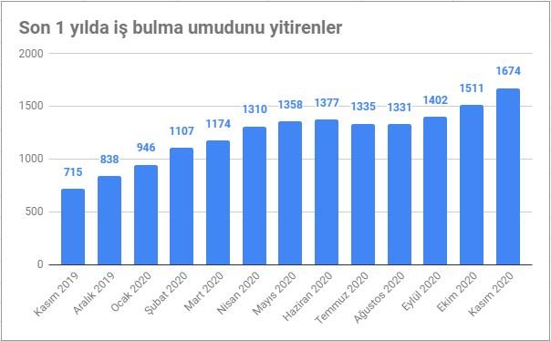 Kasım 2019 döneminde iş bulma umudu olmayanların sayısı 715 bindi. Bir yılda bu sayı 959 bin kişi artarak 1 milyon 674 bine çıktı. Böylece Türkiye tarihinde ilk kez iş bulma umudunu yitirenlerin sayısı 1.6 milyon kişiyi aşarken, son bir yıllık yükselişteki istikrar ise dikkat çekti.