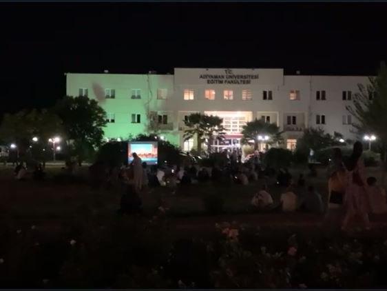 Adıyaman Üniversitesi’nde gerçekleştirilen bu organizasyonu izlemeye gelen gençler kapalı alana sığmayınca Eğitim Fakültesi Binasının bahçesine, tam da üniversite girişinde yer alan Atatürk Büstünün hemen arkasında kurulan ekrandan çimler üzerine oturup izledi.