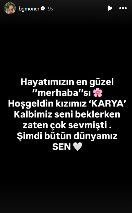 Begüm Öner duygularını, "Hayatımızın en güzel 'Merhaba'sı. Hoş geldin kızımız Karya. Kalbimiz seni beklerken zaten çok sevmişti. Şimdi bütün dünyamız sen..." sözleriyle sevinçlerini takipçileriyle paylaştı.