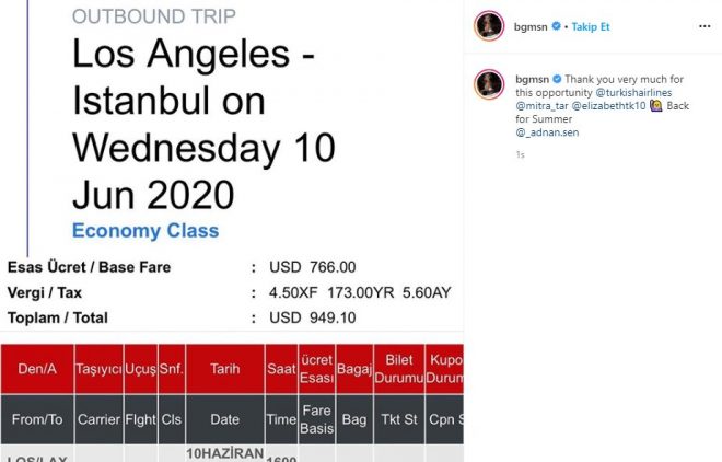 Ayrıca Begüm Şen de Instagram hesabından uçak biletini paylaşarak, iddiaları yalanladı.