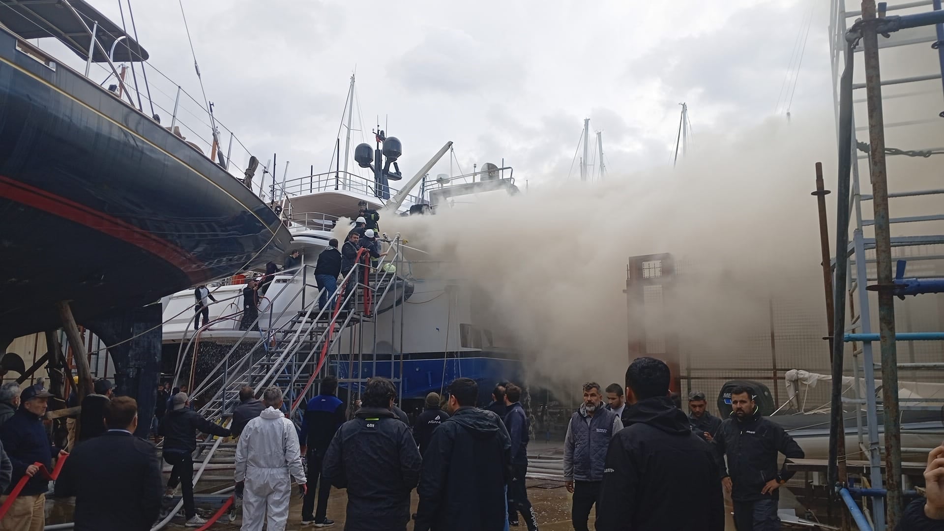 Kumbahçe Mahallesi Tersaneler mevkiinde yüzlerce teknenin bulunduğu bir tersanede bakım için karaya alınan 22 metre boyundaki lüks motoryatta yangın çıktı.