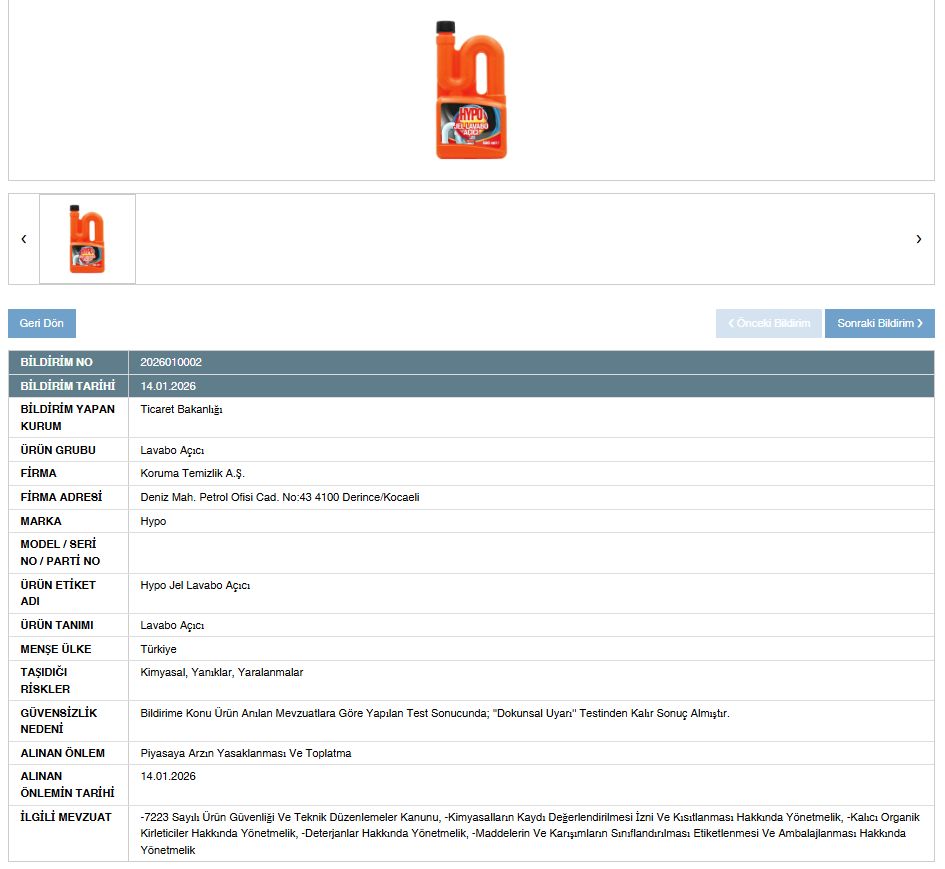 Ticaret Bakanlığı’nın 14.01.2026 tarihinde yayımladığı bildirimde, Koruma Temizlik A.Ş. tarafından üretilen "Hypo Jel Lavabo Açıcı" isimli ürünün teknik mevzuatlara uygun olmadığı açıklandı. Yapılan resmi incelemeler sonucunda bildirime konu ürünün, anılan mevzuatlara göre yapılan testlerde "Dokunsal Uyarı" testinden kalır sonuç aldığı belirtildi.