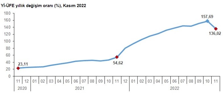 Buna göre, 2022 yılı Kasım ayında Yİ-ÜFE bir önceki aya göre yüzde 0,74, bir önceki yılın Aralık ayına göre yüzde 98,20, bir önceki yılın aynı ayına göre yüzde 136,02 ve on iki aylık ortalamalara göre yüzde 128,94 artış gösterdi.
