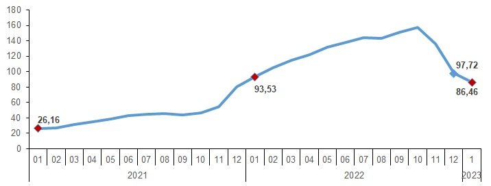 Buna göre, Yİ-ÜFE (2003=100) 2023 yılı ocak ayında bir önceki aya göre yüzde 4,15, bir önceki yılın aynı ayına göre yüzde 86,46 ve on iki aylık ortalamalara göre yüzde 125,53 artış gösterdi.