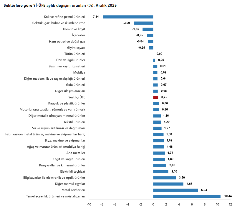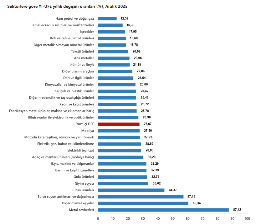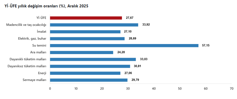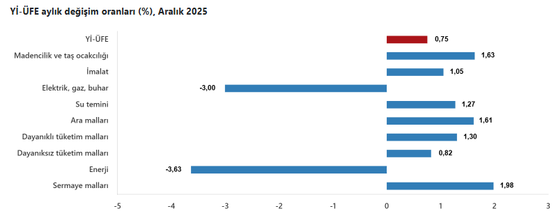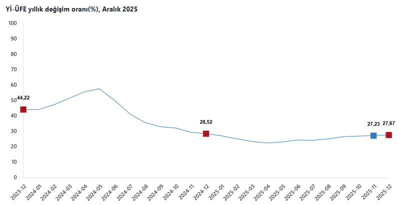 Yİ-ÜFE (2003=100) 2025 yılı Aralık ayında bir önceki aya göre yüzde 0,75 artış, bir önceki yılın Aralık ayına göre yüzde 27,67 artış, bir önceki yılın aynı ayına göre yüzde 27,67 artış ve on iki aylık ortalamalara göre yüzde 25,36 artış gösterdi.