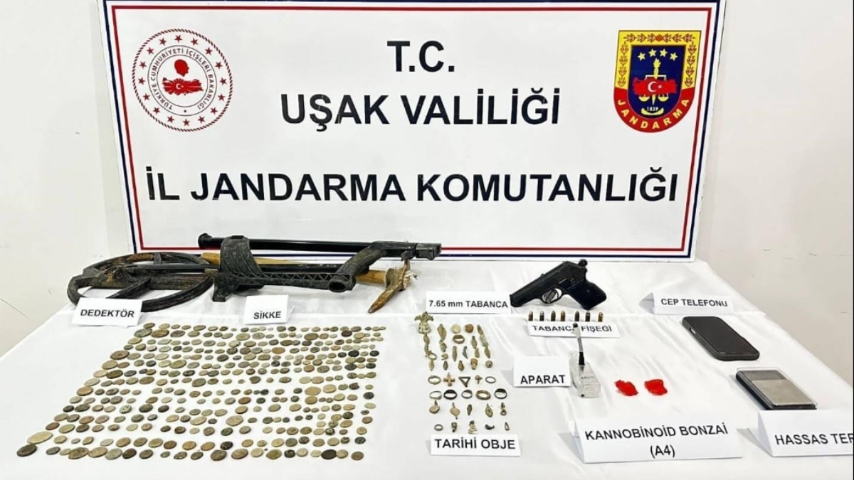 Ekipler, aramada Roma ve Bizans dönemlerine ait olduğu değerlendirilen 320 sikke, 30 tarihi obje, tabanca ve dedektör ele geçirdi.