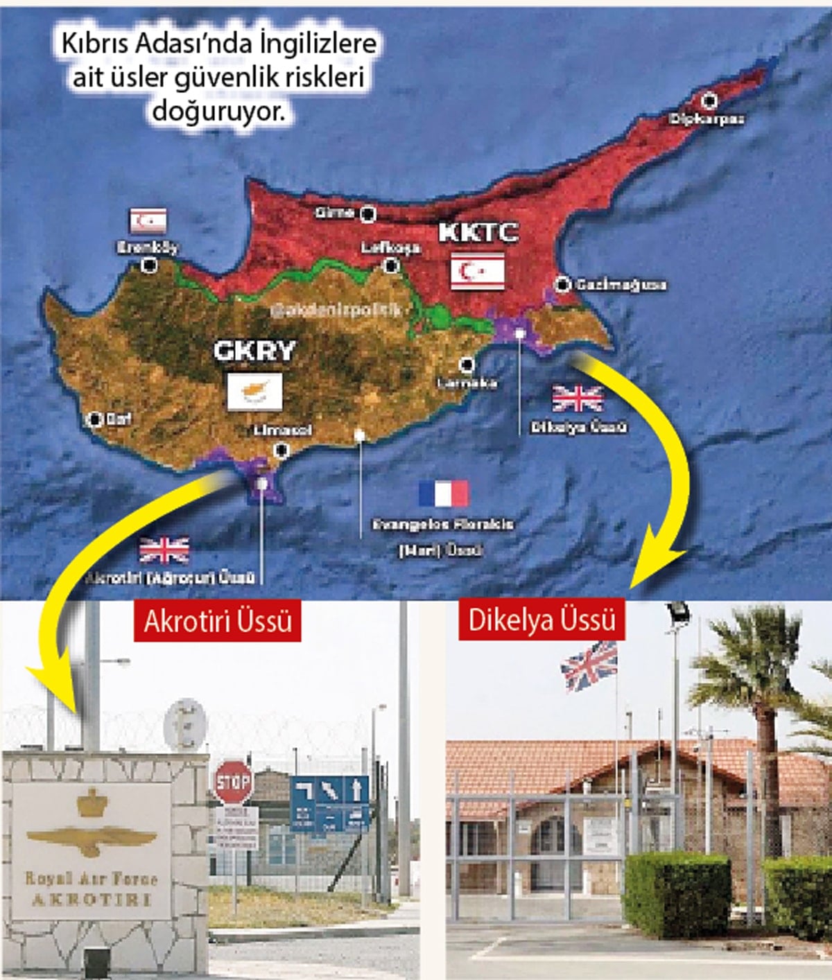 Güney Kıbrıs’taki İngiliz Agratur ve Dikelya Üslerinin İran dronları ile saldırıya uğraması, Türkiye, Yunanistan, KKTC ve Güney Kıbrıs’ı tedirgin etti. Dikelya Üssünün KKTC’deki Beyarmudu beldesine bitişik olması KKTC’yi ürkütüyor.