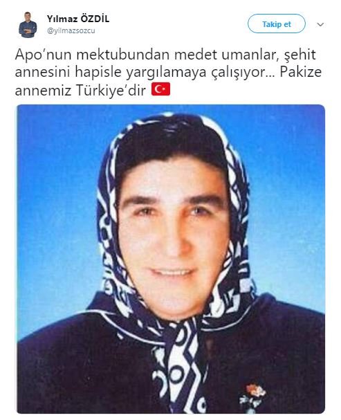 "Apo’nun mektubundan medet umanlar, şehit annesini hapisle yargılamaya çalışıyor... Pakize annemiz Türkiye’dir" diye ifadelerde bulundu.