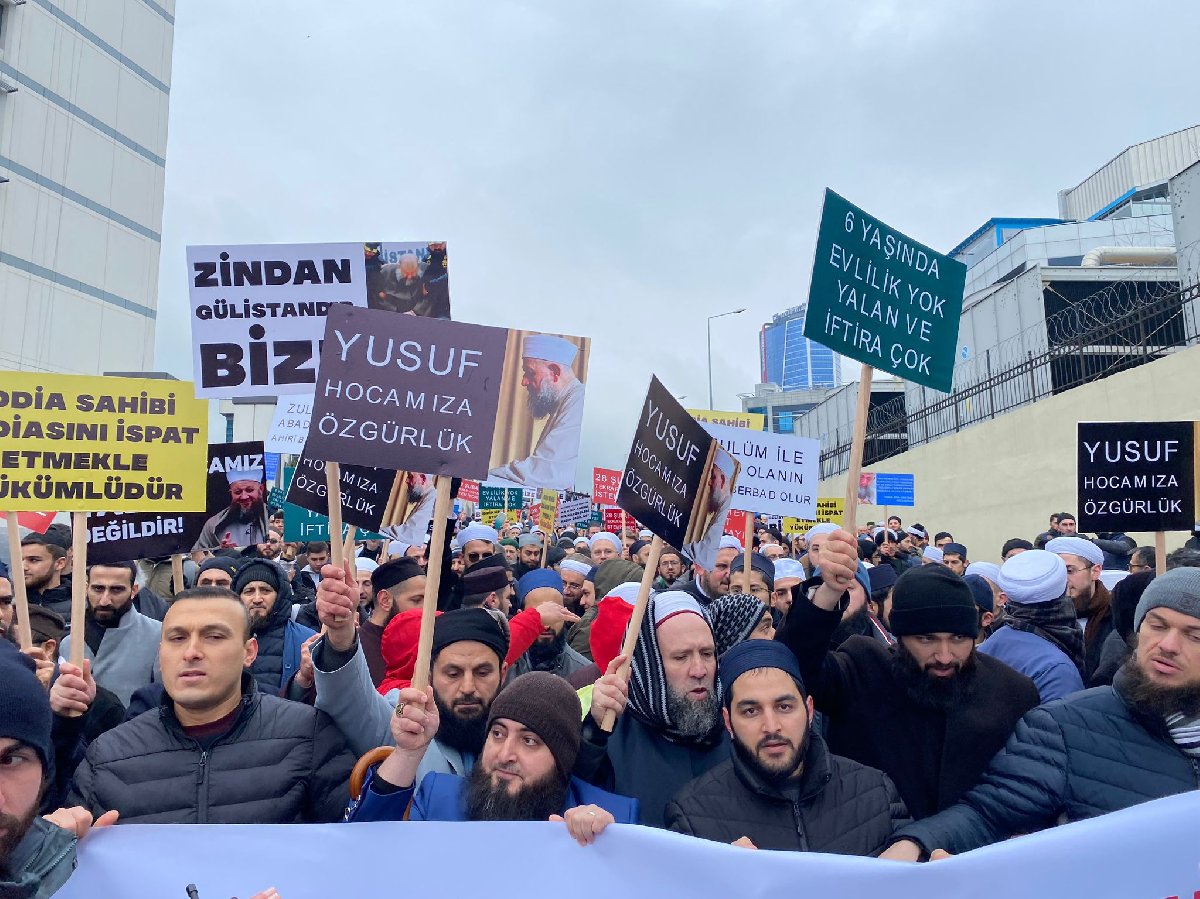 Müritlerden bazıları "Yusuf Hocamız yalnız değildir", "Mahkeme, azgın azınlığa yol verme" sloganları attı..