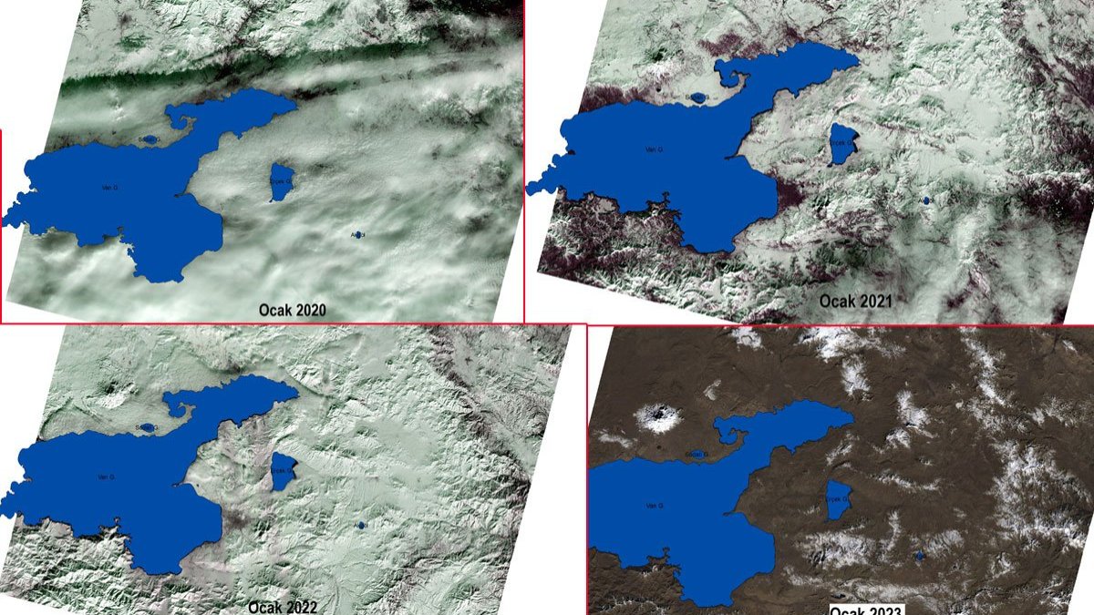 Yerde karın olmadığı kentte, son zamanların en kurak kışı yaşanıyor. Van YYÜ Su Ürünleri Fakültesi Dr. Öğretim Üyesi Mustafa Akkuş, son 4 yılın ocak ayına ait Landsat uydu görüntülerini paylaştı.