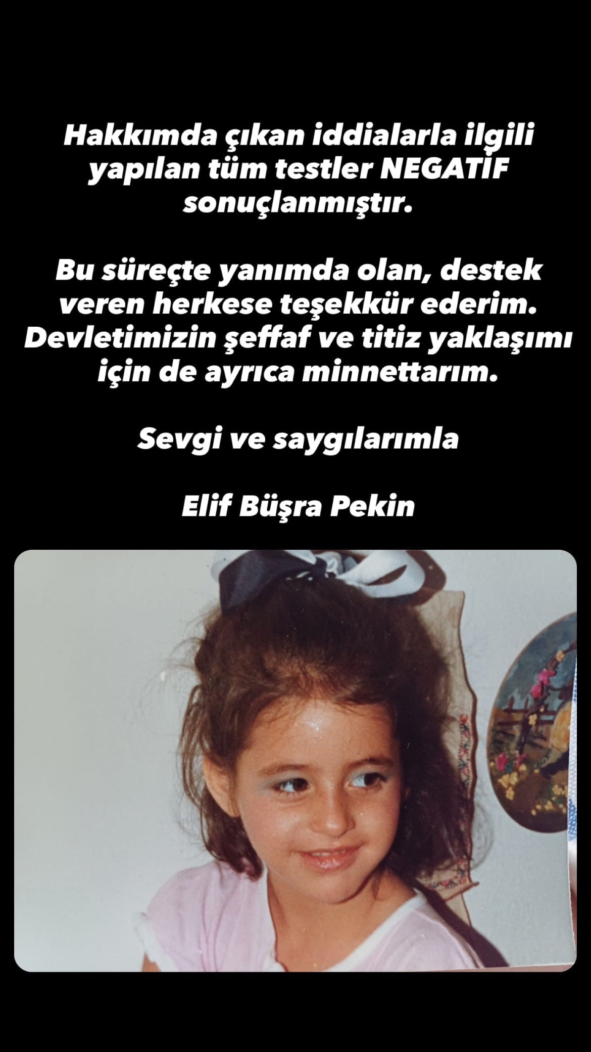 Test sonucu negatif çıkan Büşra Pekin sosyal medyada yaptığı açıklamaya çocukluk fotoğrafını da ekledi.