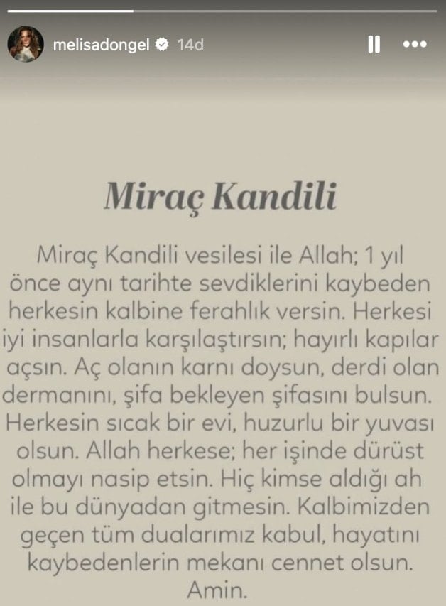 Oyuncu, kandil mesajında birlik, huzur ve şifa temennilerine yer verirken, adalet, dürüstlük ve kalpten edilen duaların kabul olması yönünde dileklerde bulundu. Döngel’in paylaşımı kısa sürede sosyal medyada dikkat çekti.