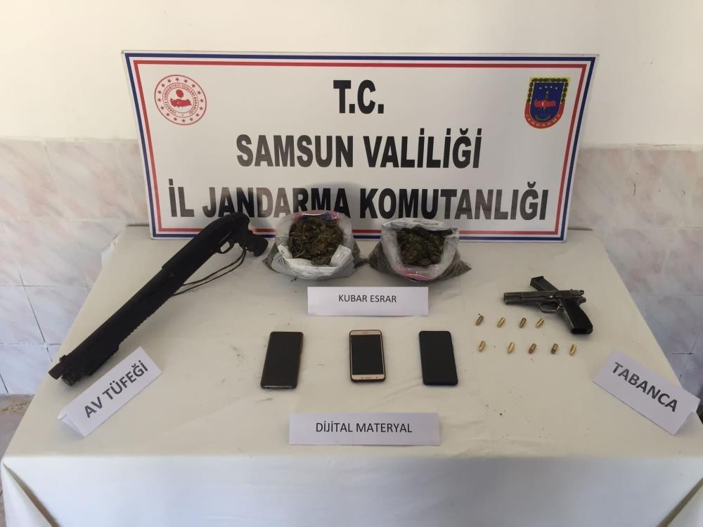 JASAT ekipleri de çalılık alana atılan içinde 500 gram esrar bulunan poşeti ele geçirdi. Ekiplerce E.A'nınş evinde yapılan aramada 1 adet ruhsatsız tabanca ve 1 adette ruhsatsız av tüfeği ele geçirdi.