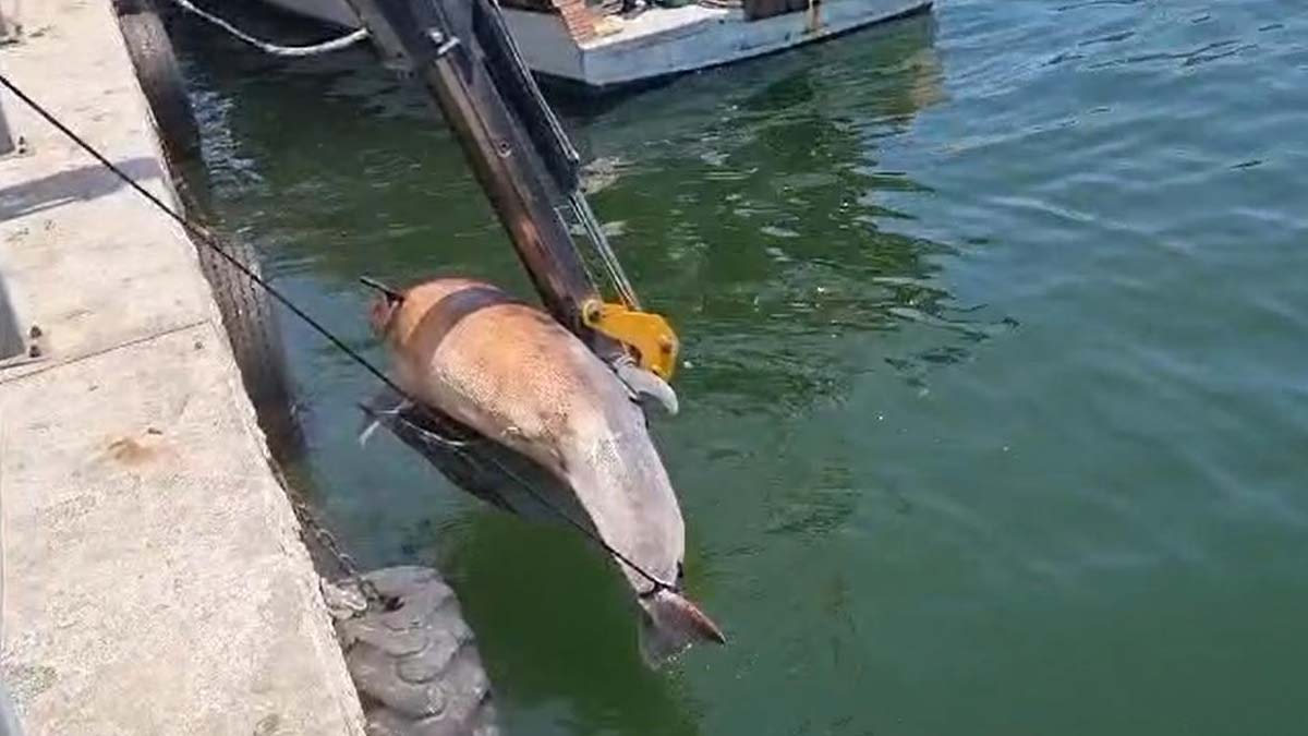 Denizden çıkarılan yunus, Gemlik İskele Meydanı'na getirilerek, inceleme için Gemlik Belediyesi Sağlık İşleri Müdürlüğü ekiplerine teslim edildi.