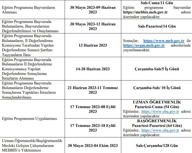 Uzman Öğretmenlik Eğitim Programına göre 180 saatlik eğitim 17 Temmuz 2023-08 Eylül 2023 tarihleri arasında, Başöğretmenlik Eğitim Programına göre 240 saatlik eğitim 17 Temmuz 2023-18 Eylül 2023 tarihleri arasında Millî Eğitim Bakanlığı Personeli Hizmet İçi Eğitim Yönetmeliği hükümleri çerçevesinde uzaktan eğitim yöntemiyle ÖBA (https://www.oba.gov.tr) üzerinden gerçekleştirilecek.