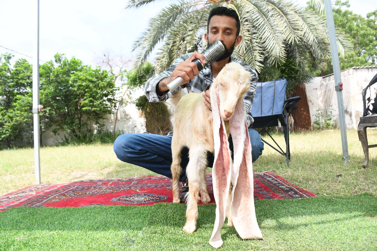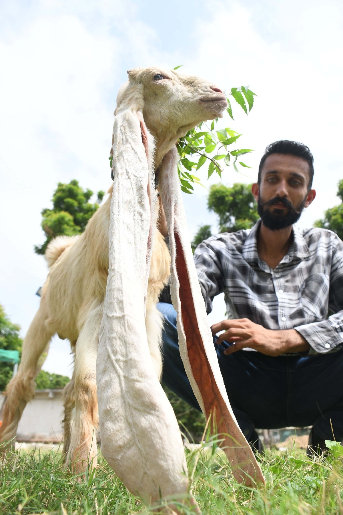 Guinness Rekor Kitabı'na başvuran ve yetkililerinden yanıt bekleyen Simba'nın sahibi Muhammad Hassan Narejo, sevimli keçinin kulaklarını ise tarakla tarıyor.